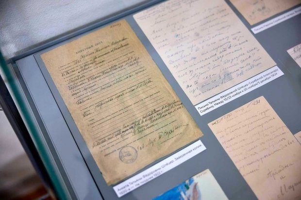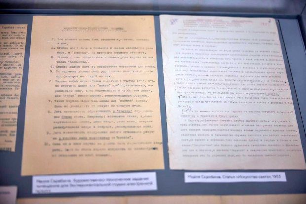 В витринах выставки можно рассмотреть документы. Представлены, например, анкетные листы научных сотрудников музея Любови Александровны Скрябиной и Татьяны Федоровны Шлёцер, статья Марии Скрябиной «Искусство света», а также художественно-техническое задание для помещения будущей экспериментальной студии. Здесь же театральная программка, относящаяся к периоду, когда Мария Скрябина играла в МХАТ II в постановке «Двенадцатая ночь», фотографии с этого спектакля и нежное письмо Александра Скрябина тетушке.