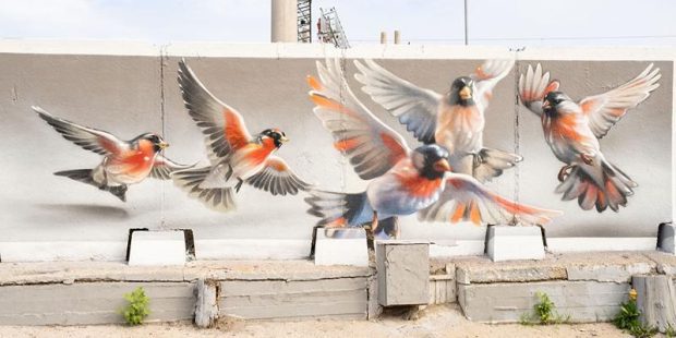Работа, занявшая первое место. Автор — Дмитрий Дренин. Пресс-служба проекта «Нетстен»Лидером голосования стал мурал Дмитрия Дренина. Художник изобразил полет снегирей.