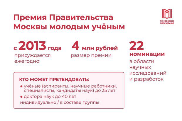 «Премия вручается с 2013 года за выдающиеся результаты фундаментальных и прикладных исследований. Претендовать на нее могут московские ученые в возрасте до 35 лет, доктора наук — до 40. По сравнению с предыдущим годом размер премии увеличили в два раза — с двух до четырех миллионов рублей», — написал Мэр Москвы в своем телеграм-канале.
