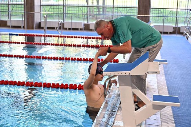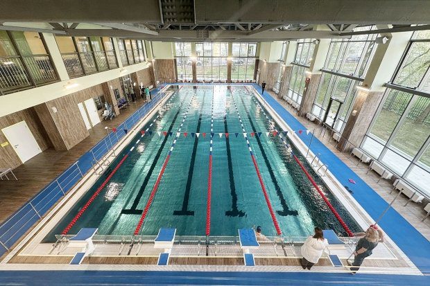 — бассейн для оздоровительного плавания 25 на 11 метров на четыре дорожки с трибунами для зрителей, для комфортного погружения в воду учащихся с инвалидностью установлен стационарный подъемник;