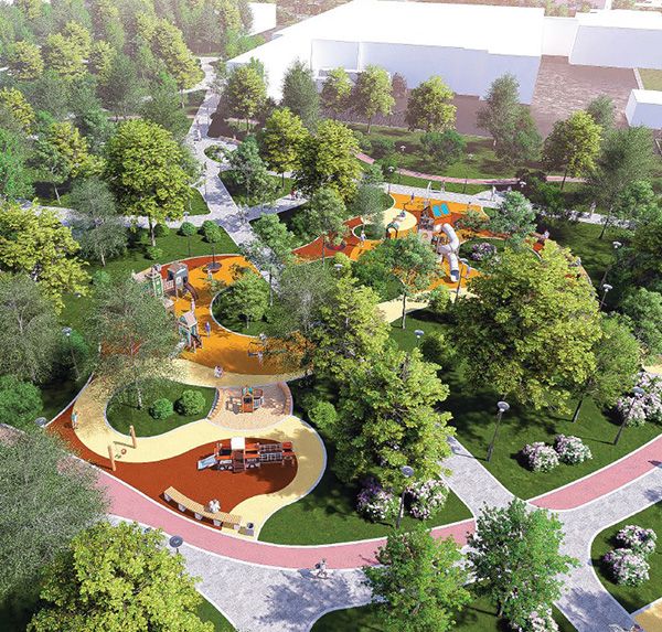 В игровой зоне около входа в парк со стороны Фестивальной улицы поставят большие качели, комплекс-лабиринт и разноцветные батуты. Рядом оборудуют многоуровневый амфитеатр и островки для отдыха с навесами-зонтиками, круглыми скамейками под ними и парковыми качелями. Неподалеку сделают огороженную современную площадку для выгула собак. Для животных установят барьеры, горку, тоннель и балансир.