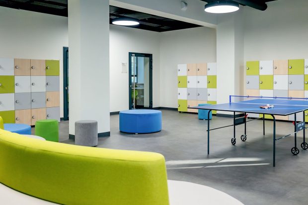 Здание школы полностью обновили — от фасада до учебных кабинетов. Вместо обычных коридоров появились просторные рекреации с мягкими диванами, яркими пуфами и удобными подоконниками-сиденьями. Эти пространства предназначены не только для отдыха — здесь можно готовиться к урокам, проводить внеклассные занятия или родительские собрания.