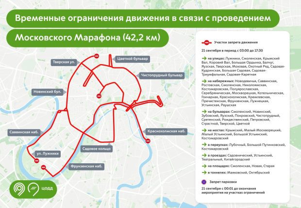 В связи с проведением в центре Московского марафона 20 и 21 сентября будет временно закрыто движение для транспорта более чем на 60 улицах и набережных города.