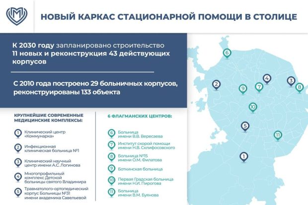 Среди них новейшие медицинские комплексы, в том числе Московский многопрофильный клинический центр (ММКЦ) «Коммунарка», инфекционная клиническая больница № 1, шесть флагманских центров на базе крупнейших многопрофильных больниц (городской клинической больницы (ГКБ) имени В.В. Вересаева, Научно-исследовательского института (НИИ) скорой помощи имени Н.В. Склифосовского, ГКБ № 15 имени О.М. Филатова, Московского многопрофильного научно-клинического центра (ММНКЦ) имени С.П. Боткина, ГКБ № 1 имени Н.И. Пирогова, ГКБ имени В.М. Буянова), Московский клинический научный центр (МКНЦ) имени А.С. Логинова, новый многопрофильный комплекс детской городской клинической больницы (ДГКБ) святого Владимира и травматолого-ортопедический корпус ГКБ № 31 имени академика Г.М. Савельевой.