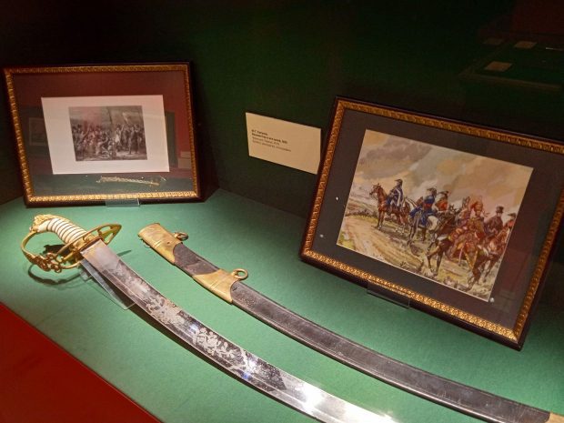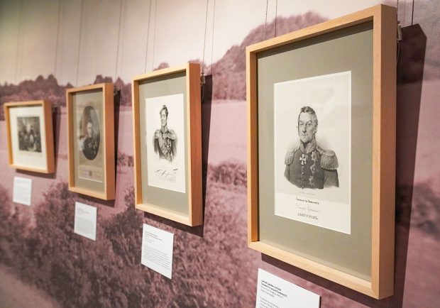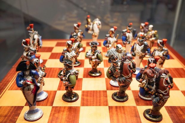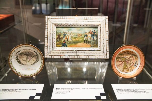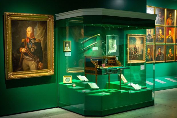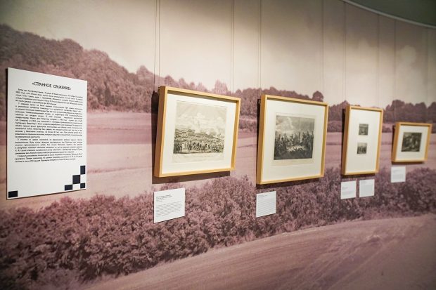 На выставке запоминаются шахматы. Это современные фигуры (2012), но интересные своей детализацией. На доске — Александр I, Наполеон, Кутузов, Даву, Мюрат. Это реконструкция партии, придуманной русским шахматным мастером Александром Петровым в 1823 году. В детстве он стал очевидцем войны.