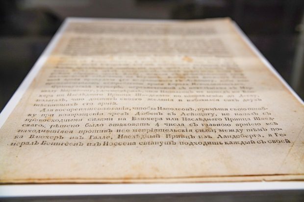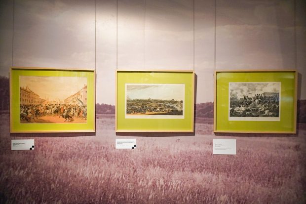 На выставке есть гравюра неизвестного художника, которая представляет камерную сцену: Александр I во время битвы под Лейпцигом. «Гравюра называется “Александр I молится во время Битвы народов под Лейпцигом в 1813 году”. Известно, что он находился у деревни Гросс, за нее шли сражения в первый день. Он молился о благополучном исходе битвы для объединенной армии», — завершает Виктория Павленко.