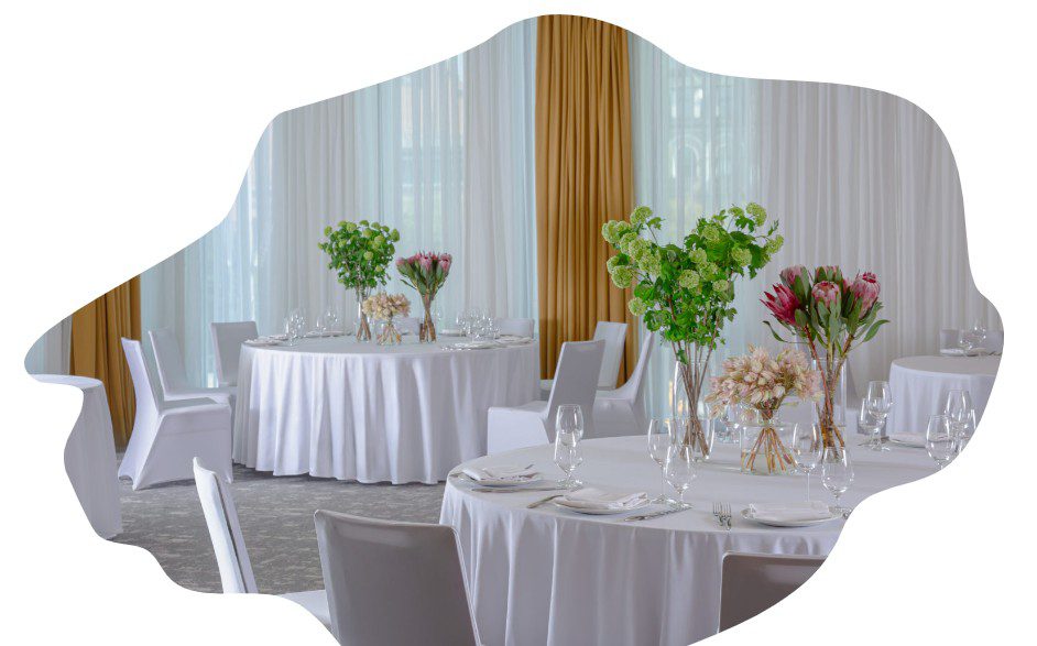 Размеры зала зависят от количества приглашённых. В помещении должны свободно располагаться столы, оставаться место для танцев, музыкантов и артистов (если планируется шоу-программа). Наличие небольшой эстрады – весомый плюс, но если размеры зала не слишком велики, в ней нет особой необходимости. Стоит сразу уточнить, имеется ли помещение, где артисты могут переодеться и подготовиться к выступлению.