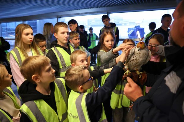 Оказалось, не только четвероногие помощники участвуют в жизни аэропорта. Безопасность полетов также обеспечивают орнитологи и их пернатый воспитанник — ручной сокол. Школьникам объяснили, как хищник отпугивает чаек, серых куропаток, бекасов, голубей и ворон с летного поля, чтобы птицы не попали в двигатели самолета при взлете и посадке.