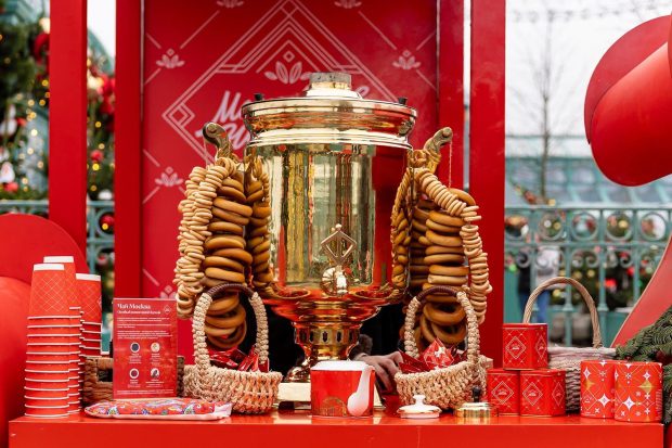 Чайная станция «Московское чаепитие» приглашает гостей на теплое зимнее угощение. Воду в самоваре вскипятят на украшенных санях, а ароматный чай разольет актер-самоварщик.