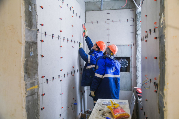 Во всех девяти корпусах уже завершили работы по демонтажу, устройству плит перекрытий, стяжке пола, усилению дверных проемов, возведению стен и перегородок в помещениях, монтажу окон, штукатурке и шпаклевке стен и потолков. Кроме того, закончили фасадные работы по устройству утеплителя и армированного базового слоя штукатурки, а также укладке нижнего защитного слоя кровли.