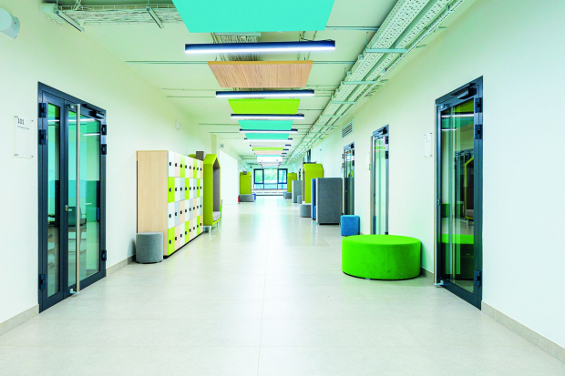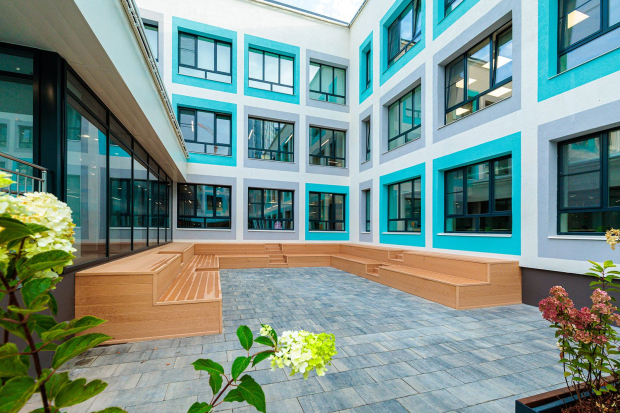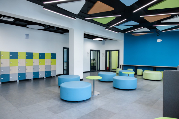 Стены оформляют в светлых тонах с яркими акцентными вставками. В тамбурах и вестибюлях кладут светлую плитку под кирпич, а в обеденных залах и санузлах — керамическую. После окончания чистовых работ на лестницах установят многоуровневые перила для детей разного роста. Системы видеонаблюдения и контроля доступа выведут на пост охраны. В вестибюлях, коридорах и рекреациях поставят мягкую мебель.