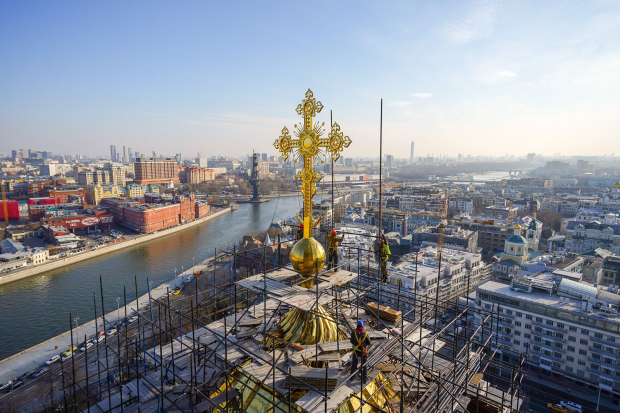 Фото: Максим Мишин. Пресс-служба Мэра и Правительства МосквыСейчас в храме Христа Спасителя ведутся работы по ремонту главного купола и куполов звонниц, а также воссозданию крестов кафедрального собора.